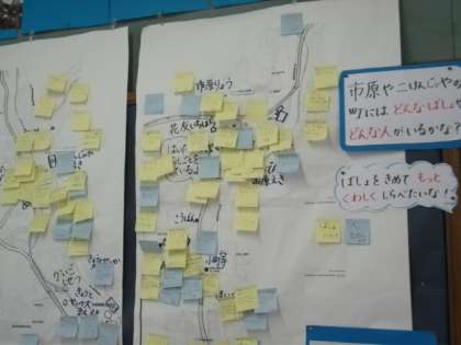 後ろの掲示板には,生活科で話し合ったことがまとめてあります。「どこにどんな仕事場があるのか」「どんなお仕事をされているのか」子どもたちの目線で書き綴られています。