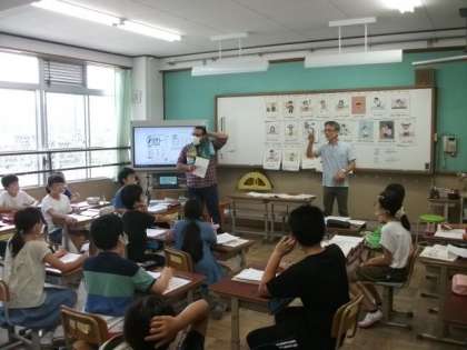 5年生は,ALTの先生と一緒に外国語科の学習を進めています。得意なことや好きなことは何かを友達同士で尋ねる活動をしました。(外国語科などで,意見交換する場面では,表情が見えるように透明のマウスガードを使用しています。)