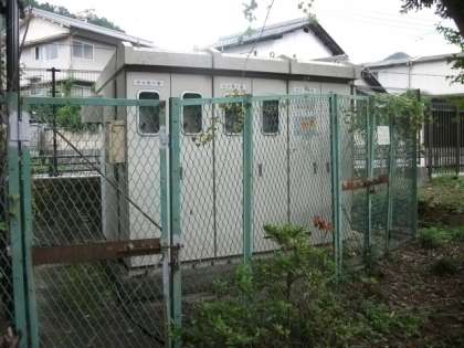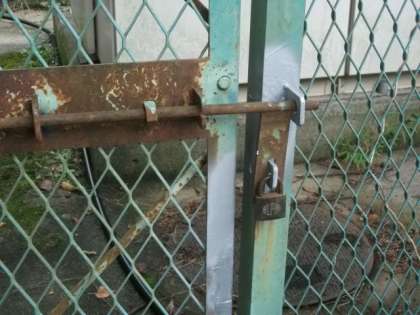学校の敷地内にある「キュービクル式高圧受電設備」のまわりに鉄策を設けています。入口のかぎの部分が固くなっていたので修理をしました。(本施設は,子どもたちは普段立ち入ることのない場所にあります。)