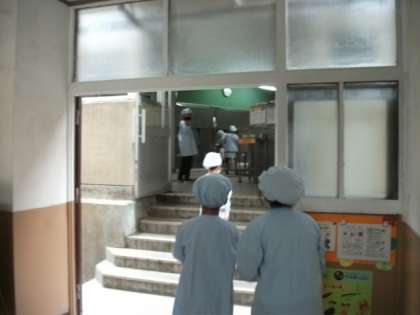 給食の時間です。今日は,材料を検品した結果,一部を交換することになり,本日の給食の開始時刻がいつもと比べて少し遅くなりました。(配膳時間が短くなりましたが