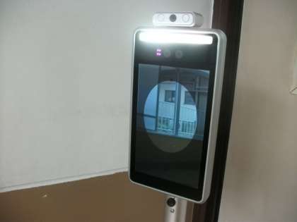 校長室前に,検温できるタブレットを設置しました。