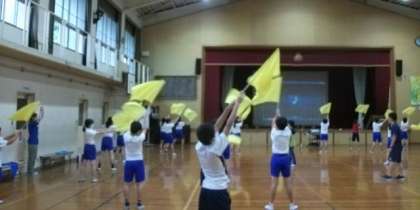 (写真は,6年生のフラッグの演技練習の一コマです。)