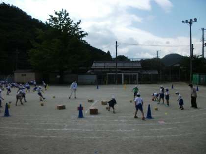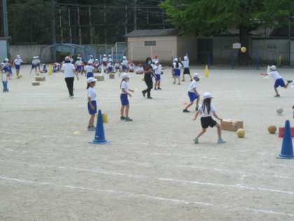 1,2年生の体育の様子です。ボールけりゲームをしています。