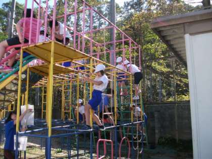2年生の体育学習の様子です。総合遊具の安全で楽しい遊び方をもう一度学習しています。そのあと,ドッジビーにも挑戦していました。