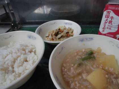 「じゃがいものそぼろ煮」は,最後に水とき片栗粉でとろみをつけています。