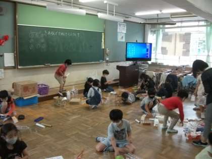 2年生は,生活科「あそんで ためして くふうして」に取り組んでいます。廃材をはじめいろいろな材料を組み合わせて,どんな遊びや活動ができるかを考えています。6年生は,ぐんぐんタイムで,タブレットドリルに取り組んでいます。取り組んでみたい教科や問題が,自分で選べるのが魅力の一つです。