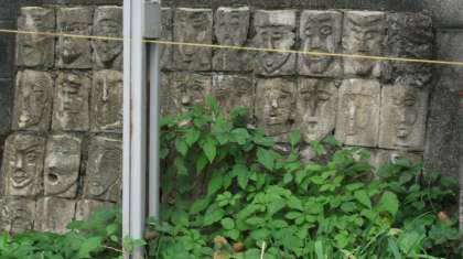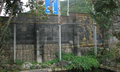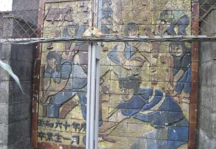 校門を入ってすぐ左側に池があります。ブロック塀には,卒業生の作品が飾られています。力強い作品が,子どもたちの成長を見守ってくれています。