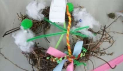 1年生の教室に,アサガオのつるでつくったリースが飾られています。