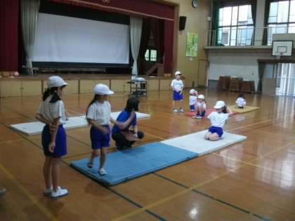 2年生は体育の時間にマットを使っていろいろな動きに挑戦しています。
