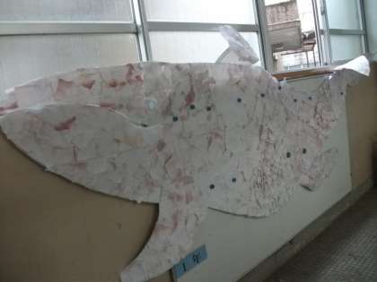 始業前に,校舎内を見回っていると,1年生の教室前に,大きなくじらぐもが…