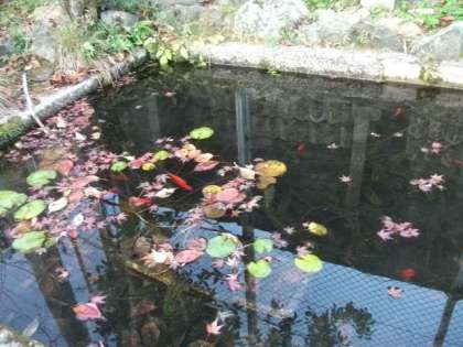 池にもみじの葉が散っています。