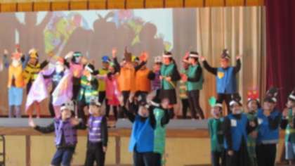 外国語活動で学習した英語を使って,絵本「はらぺこあおむし」を基本にして英語劇に挑戦しました。かわいい衣装を手作りし,グループに分かれて練習を積み重ねてきました。歌の振付けも工夫しました。