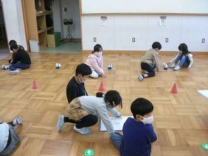 くっつけるブロックの図柄から規則性をみつけます。そのあと,「コーンをさけてすすめるにはどうしたらいいだろうか」という課題をクリアするために,話し合いの時間をとりました。5つの班が,それぞれ違うプログラムを考え,どれがいいアイデアかを,ロボットを動かして確かめていきます。もう少しでゴールに到着しそうなロボットや,まったく違う方向に進んでしまったロボットがありました。