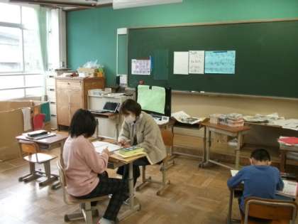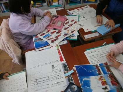 3組は,プリント学習に取り組んでいます。1年生は,国語科「じどうしゃくらべ」でお気に入りの車について調べてノートに書いています。