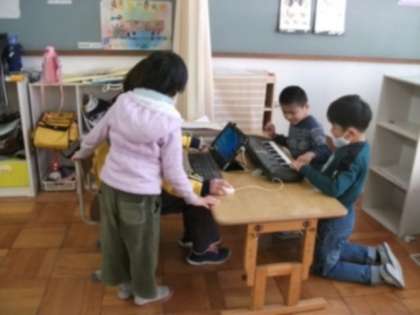 3組の学習の様子です。朝のトレーニングで体を動かした,教室で学習を始めました。音楽に取り組んでいるグループもあります。