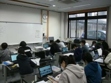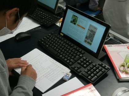 図書館と併設しているという利点をいかして,コンピュータ室で調べ学習をしています。ネット上の情報を安易に印刷して貼るということではなく,必要な部分を「自分で判断」して抜き出し,用紙に「書く作業」をとりいれています。
