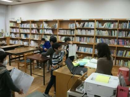 1年生のお友達が司書の先生に読書ノートを見せにきていました。