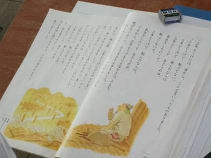 この物語は,朝鮮半島に伝わる民話です。外国の雰囲気がさし絵からもよく伝わってきます。「ため息の出るほど」よい眺めの峠の様子が,黄色を中心にほのぼのとしたタッチで描かれています。