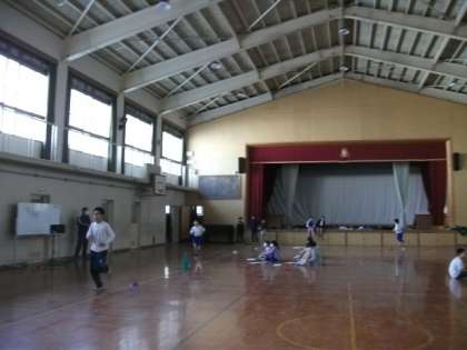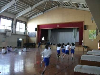 運動場が雪解けのため,使えなかったので,6年生は体育館でペース走に取り組んでいます。
