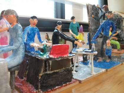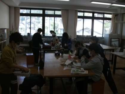 6年生は卒業制作に取り組んでいます。将来の夢やつきたい仕事について調べました。少しずつていねいに塗り重ねています。