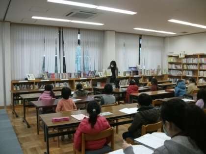 1年生が,図書館で本の紹介をしてもらっています。