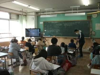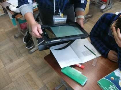 6年生は算数の学習をしています。いろいろな考え方を記したノートを撮影して,モニターに映しています。