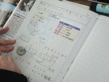 6年生は,社会科で歴史の学習を進めています。年表や出来事,写真などをノートにはり,関係性を言葉や矢印などの記号を使って補足しています。