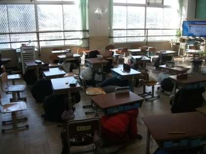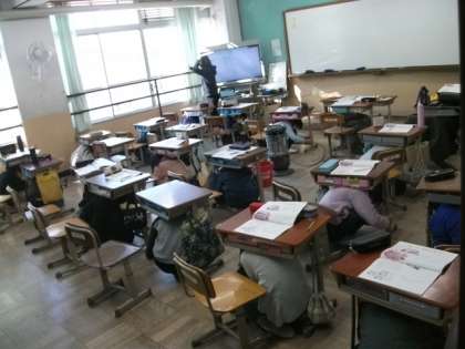 地震の訓練情報が校内放送で入りました。すばやく机の下の体を潜り込ませています。