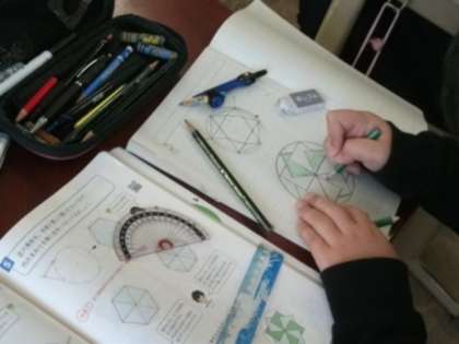 5年生は,算数で正多角形をコンパスや定規を使いながらかいています。