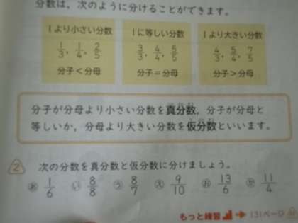 「分子が分母より小さい分数を真分数,分子が分母と等しいか,分母より大きい分数を仮分数といいます。」