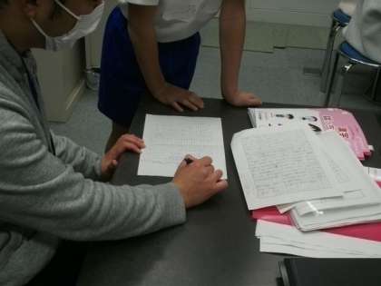 印刷したものを見ながら,文集の内容を先生と相談しています。