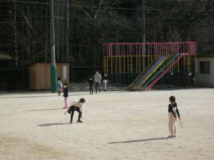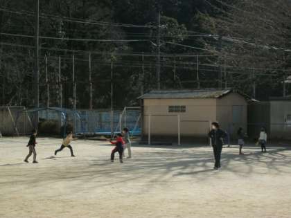 1年生は,運動場で羽子板遊びに挑戦しています。
