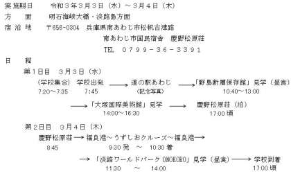 延期をしておりました修学旅行を3月3日(水)〜4日(木)に実施する予定です。コロナ禍の中で予断を許さない状況ではありますが,安全で充実した学びの機会となるよう実施していきたいと考えています。すでに訪問する施設や活動場所は下見を終えております。5月実施の場合に予定していたコースと若干変更がありますが,旅行業者を通じて,それぞれの見学場所や宿泊施設等での感染予防対策を確認しています。今後も,感染拡大防止に努めるべく,さらに調整を進めてまいりますが,参加いただく児童や保護者の協力も必要となってきます。とりわけ,体調管理については,十分ご留意いただきますようにお願い申しあげます。