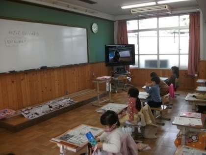 1年生の教室では,Zoomを使い,2教室で同時に図画工作の学習を進めています。どんな作品をつくりたいか,イメージをカメラを通して交流しています。