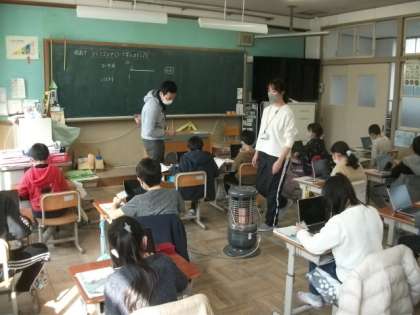 3年生が,GIGAタブレットを使って,ローマ字入力の練習をしています。学生ボランティアの方にもサポートをしていただきました。