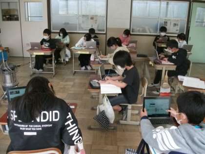 5年生は,魅力的な発表ができるように,よりよい言葉探しに取り組んでいます。教科書で調べたり,GIGAタブレットを使ったりしています。