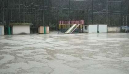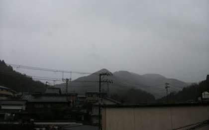 朝から雨が降っています。運動場には大きな水たまりができています。