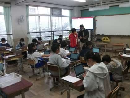 5年生は,GIGAタブレットを使って,国語の言葉調べをしています。表現したい内容や雰囲気やきちんと伝わるように,一番ふさわしい言葉・使いたい言葉を,ネットの情報を参考にしながら選んでいます。