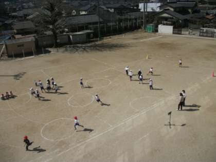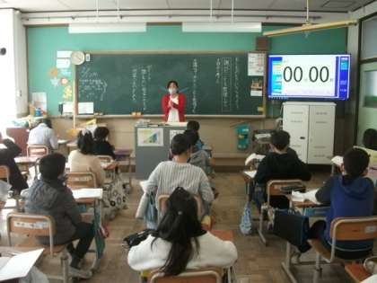 1年生は運動場で体育をしています。4年生は,「もしもに備えて」というテーマに基づき,自分の考えを整理しています。