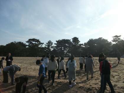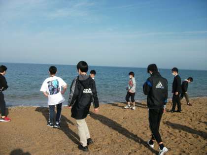 きれいな海です。何人かのお友達は,砂浜のごみを集めてくれました。