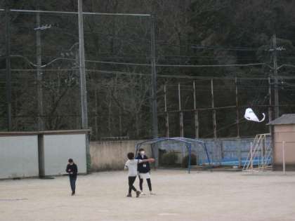 3組は,手作りの凧をあげています。ほとんど風がないので,結構長い距離を走ってあげています。