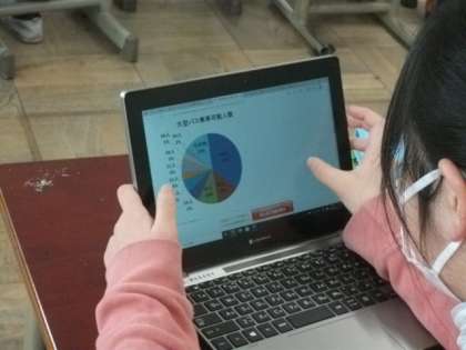 5年生は,社会科で運輸について調べています。今日は大型バスをテーマに,運行スケジュールや工夫されているところについてGIGAタブレットを使って調べています。