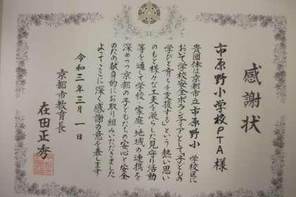 日常的な見守り活動に加え,毎月「5のつく日」に見守りの呼びかけをしていただいたり役員の皆様には校門前で声かけをしていただいたりしたことを受け,この度,感謝状が届きましたので,PTA会長様に代表受領をしていただきました。