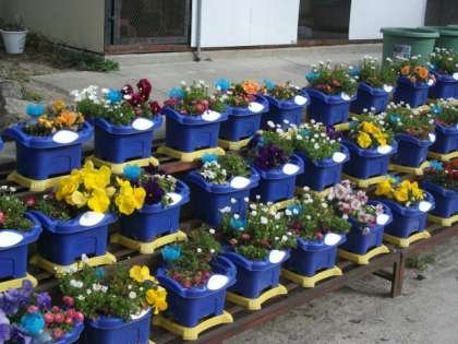卒業式の日には,運動場に恒例のフラワーロードが設置されます。園芸委員会のお友達や低学年のお友達が心を込めて育ててきた花で,卒業生の門出をお祝いします。