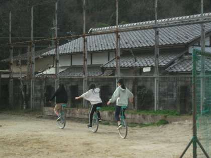 運動場ではドッジボールや鉄棒遊びのほかに,一輪車で遊んでいるお友達もいます。