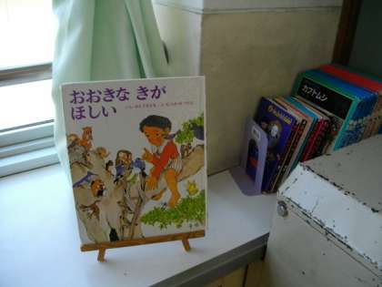 それは手をまわしたって抱えられないような太い木で、はしごをかけて上へと登っていきます。木の幹にぽっかり空いた洞穴の中にもはしご。せっせと登っていくと、いきなり可愛い部屋の中へ! そこは枝が三つに分かれたところに建てたかおるの小屋。テーブルと椅子、そして小さな台所まであるのです。ここでかおるはホットケーキを焼きます・・・