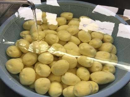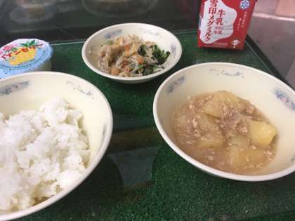 ゴロっとした【新じゃがいも】を少し大きめの一口サイズに切って煮込んでいきました。鶏ひき肉のうま味と新玉ねぎの甘みが合わさったそぼろ餡を合わせていただきました。今日もおいしい給食,ごちそうさまでした。