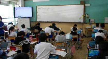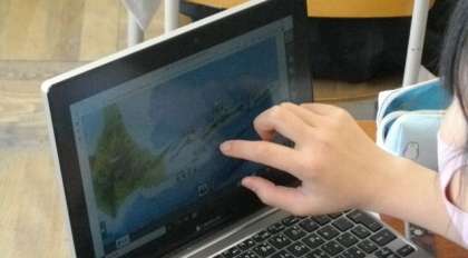 5年生は,日本の国土の特徴(地形)について,GIGAタブレットを使ってしらべています。拡大が自由にできるところが,利点です。