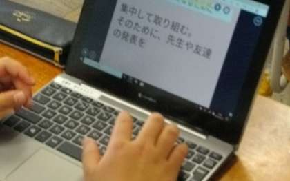 以前ならば黒板に意見を書いてまとめていましたが,「自分の意見」を表明し「友達の意見」に学ぶ取組をタブレットを使って進めることができています。