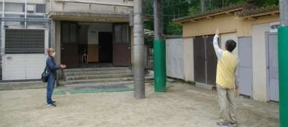 市原野体育振興会の方々にご来校いただき,防球ネットや照明設置をしている柱の点検をしていただきました。
